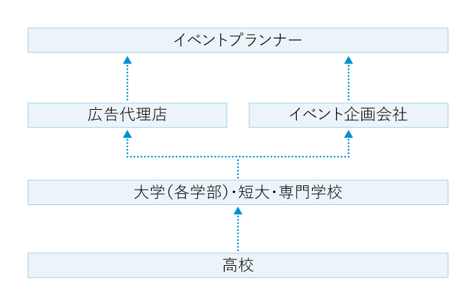 イベントプランナーになるのに、特に有利な学部・学科はない。広告代理店やイベント企画会社などで経験を積んでから就くのが一般的なコースだ。