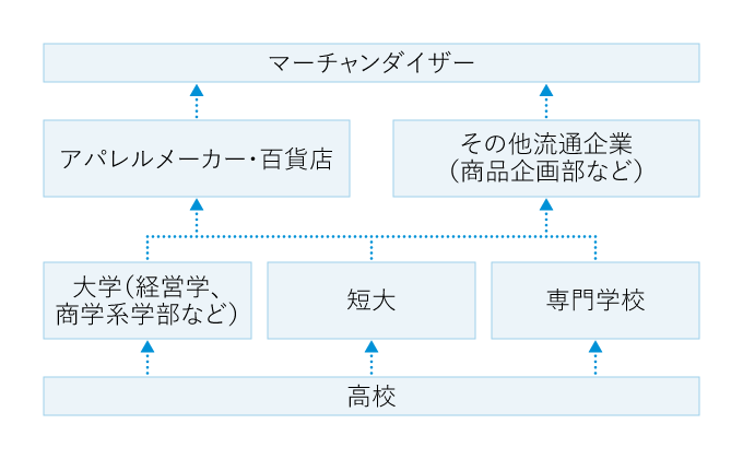 一般にマーチャンダイザーになるための第一歩は、アパレルメーカーの販売促進部門、アパレル専門店、百貨店の商品開発部などに所属することだ。ただし新卒では、多くの場合、専門職で採用されるわけではなく、総合職区分などで一括採用され、販売員や商品管理係、仕入れ係、バイヤーなどとして現場の経験を積んでから、適性によって配属されるのが一般的だ。