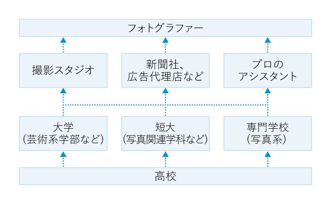 プロのフォトグラファーになるためには、専門知識や技術が必要なので、大学の芸術系学部や、短大の写真関連学科、あるいは写真専門学校などで学ぶのが一般的なコースだ。