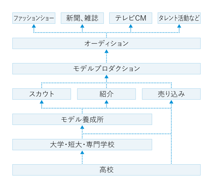 なるための第一歩はモデルプロダクションに所属することだ。街角でのスカウト、紹介、売り込みなど、モデルプロダクションに入るきっかけはさまざまである。プロダクションは適性や将来性があると判断した人を、所属モデルとして登録し、パーソナルファイル(個人資料)をつくってクライアントに営業活動を行う。仕事は一般にオーディションを受けて得る。オーディションは高倍率なので、落ちてもくよくよせず、次から次へと挑戦する前向きな姿勢が必要だ。