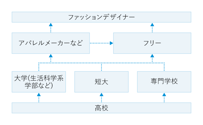 卒業後はアパレルメーカーや繊維メーカー、専門店などに就職して経験を積むが、実力が認められてチーフデザイナーになるまでには、かなりの努力が必要だ。また、最近はデザインにコンピュータグラフィックスを採用するケースもあるため、そうした技術を身につけておくと有利な場合もある。