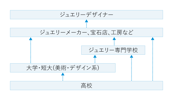 ジュエリーデザイナーをめざすなら、大学・短大の美術・デザイン系学科、ジュエリー専門学校などで、デザインや宝石・貴金属の素材について専門的に勉強するのが近道だろう。卒業後は、メーカーや宝石店にスタッフデザイナーとして就職し、その後、経験を積んで実力がつけば、フリーデザイナーとして独立することも可能である。なかには、宝石店や宝飾品店で事務員や販売員の仕事をしながら専門知識・技術を学んでいる人や、デザイン事務所に弟子入りして修業するケースもある。