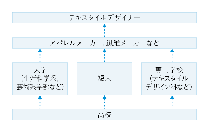 特に必要な資格はないが、専門知識や技術が必要なので、芸術系大学の染織関連学科やデザイン学科、大学、短大の生活科学系学部・学科、専門学校のテキスタイルデザイン科などで基礎を学び、アパレルメーカーや繊維メーカーなどに就職するのが一般的なコースだ。現在ではパソコンでの作業も多いので、この面のスキルも身につけておくと役立つだろう。