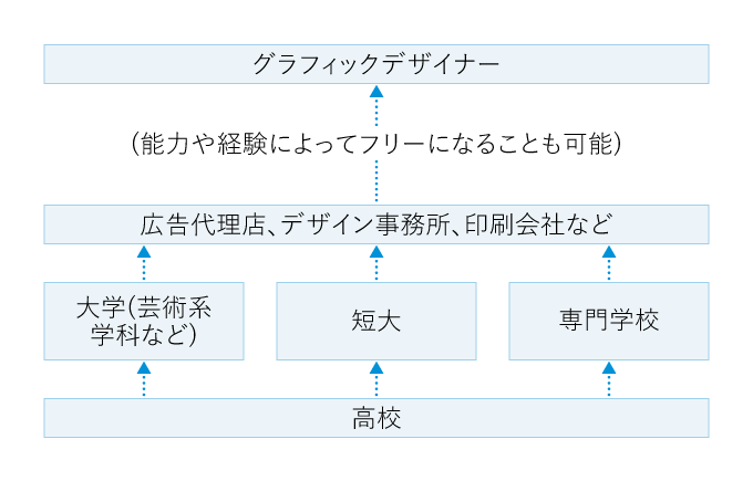 卒業後は出版社、広告代理店、広告制作プロダクション、デザイン事務所、印刷会社のグラフィック部門などに就職するのが一般的だ。勤務先では、実務を通じて学びながら経験を積む。デザインの素材集めや資料収集などからスタートし、徐々に重要な仕事を任されるようになる。順調にいけば、いずれ独立することも可能だ。
