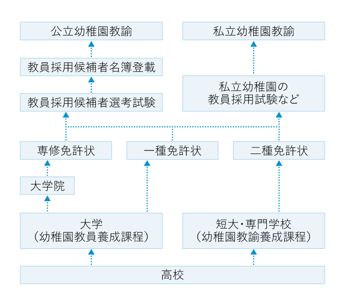 幼稚園教諭になるには、幼稚園教諭普通免許状が必要である。免許状には専修・1種・2種があり、専修は大学院、1種は大学、2種は短大などの養成課程で取得できる。免許状の種類によって給与に多少差が出る場合もあるが、仕事の内容に違いはない。