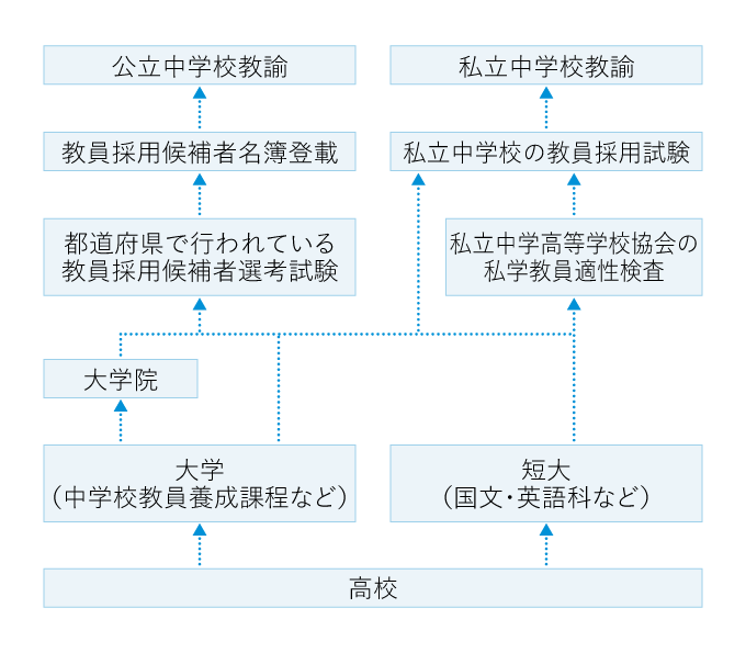 免許状取得後、公立の中学校に採用されるには、各都道府県や政令指定都市が実施する教員採用候補者選考試験に合格しなければならない。合格すると教員採用候補者名簿に登載され、面接試験などを経て配属される。私立の場合は、各中学校で独自に教員採用試験を行っている。中高一貫校は高校教諭の免許も求める場合が多い。