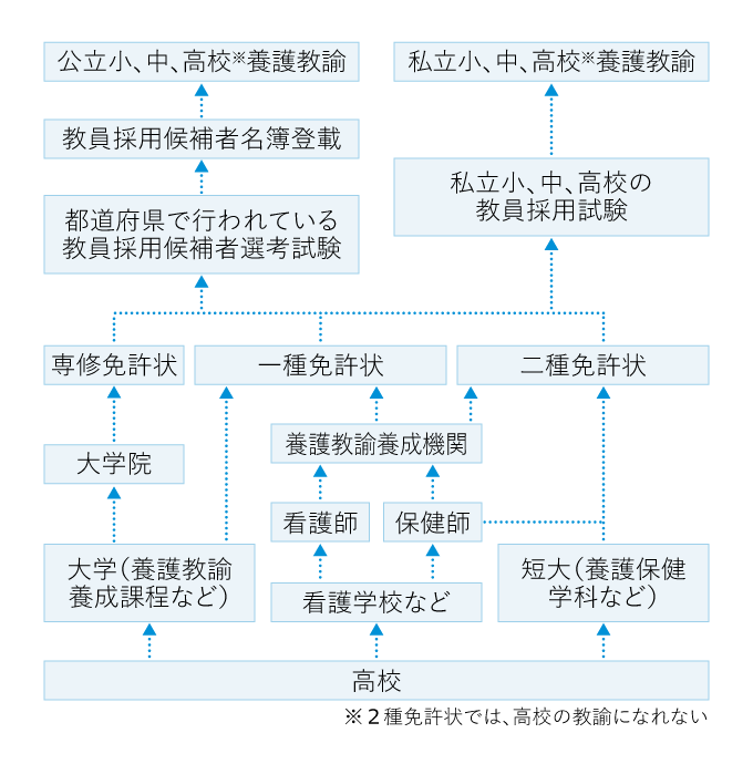 専修免許状は大学院、2種免許状は短大の養護保健学科などに進み、所定の科目を履修すると得られる。