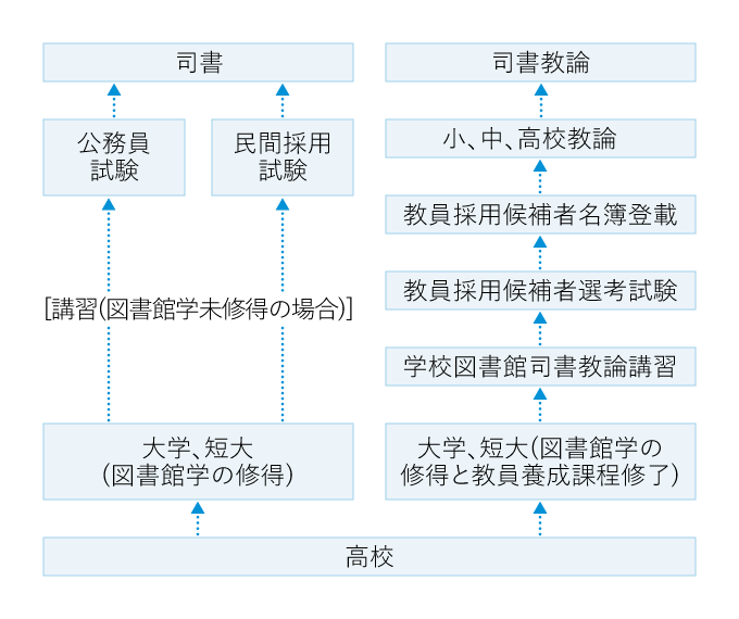 資格を取ったあとは、公立図書館の司書の場合は地方公務員試験、司書教諭は教員採用候補者選考試験にそれぞれ合格する必要がある。私立の各学校では、独自の採用試験を実施している。