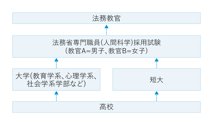法務教官になるには、法務省専門職員(人間科学)採用試験に合格する必要がある。試験では、公務員試験と同じく一般教養知識のほか、心理学、教育学、福祉、社会学などの専門的な知識が問われるので、それらの学問が学べる大学などに進学する方が有利と言える。また、そのほかにも記述形式の専門試験、面接、身体検査や身体測定がある。