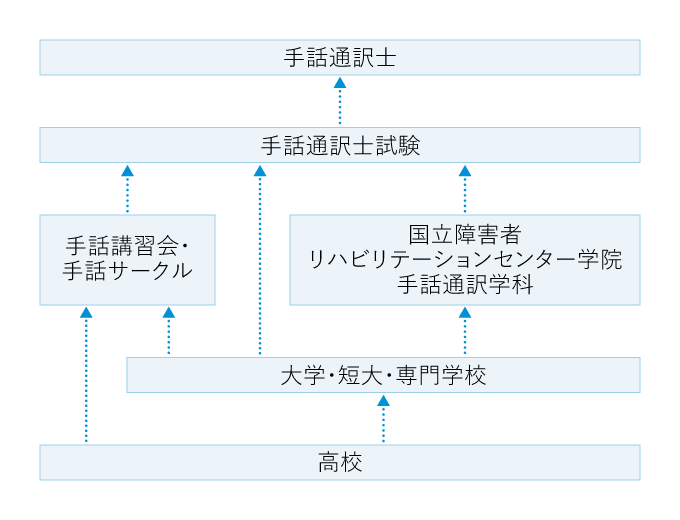 手話を学ぶには、市町村やボランティア団体などが実施している手話講習会や手話サークルに参加して手話通訳の技術を学ぶか、養成機関である国立障害者リハビリテーションセンター学院手話通訳学科で学ぶ方法がある。