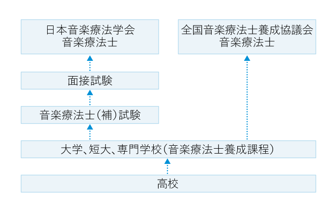 日本音楽療法学会が認定する音楽療法士になるには、認定校で体系的に学ぶことが求められる。日本音楽療法学会が養成校として認定した大学や専門学校を卒業して音楽療法士(補)試験に合格した人が、面接試験を受けることで習得できる。また、ほかの民間資格として、全国音楽療法士養成協議会の認定する音楽療法士(専修、1種、2種)資格があり、協議会の定める養成課程を修了して卒業(専修は大学院等、1種は大学等、2種は短大等)すると付与される。