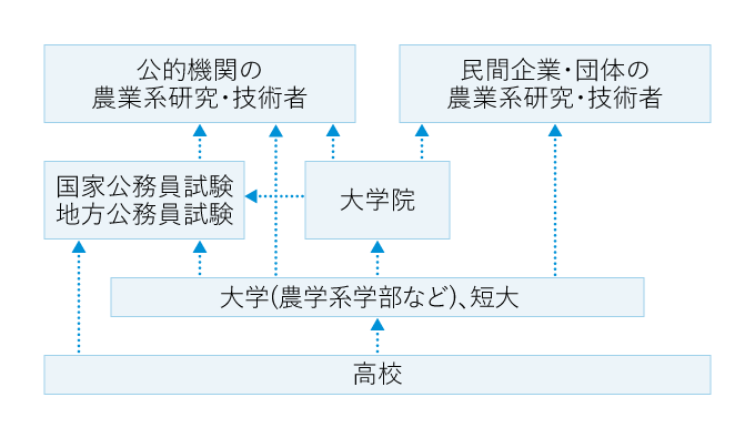 公的な立場から生産者に技術指導を行う普及指導員になるためには、公務員や農協職員として所定の実務経験を経たのち、普及指導員資格試験に合格する必要がある。受験に必要な実務経験年数は、大学院修了者は2年以上、大卒者は4年以上、短大卒者は6年以上、高卒者は10年以上となっている。