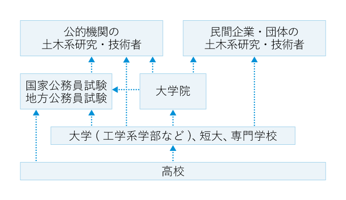 大学の土木工学科や環境土木工学科、社会基盤工学科、大学院の専門課程などを卒業して土木建設会社に勤めるか、あるいは、公務員試験の土木関連の区分などに合格して、現場で経験を積んで一人前になっていくのが一般的なコースだ。