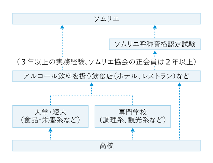 一人前のソムリエとして働くには、調理や観光についての学科・コースのある専門学校を卒業した後、ホテルやレストランでの実務経験が必要だ。ソムリエの国家資格はないものの、一般社団法人日本ソムリエ協会の「ソムリエ呼称資格」の認定を受けるのが一般的。年に1回認定試験が行われ、サービスやワインの管理についての筆記試験(一次試験)と、テイスティング・論述(二次試験)、ワインの開栓やデカンタージュのサービス実技(三次試験)があり、合格すると良質なサービスを提供できるという証明になる。一次試験実施日時点でワインやアルコール飲料を提供する飲食サービス業を通算3年以上(ソムリエ協会の正会員の場合は2年以上)経験していないと受験できない。