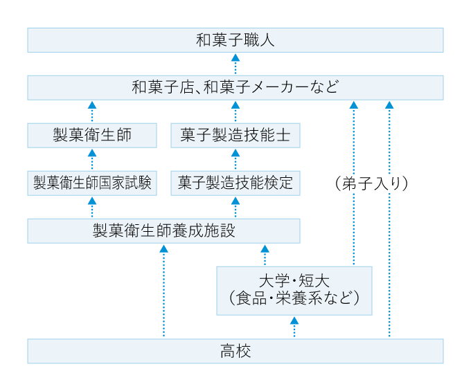 和菓子職人になるには2つの方法がある。1つは製菓の専門学校に進み、製菓衛生師や菓子製造技能士などの資格を取得して卒業し、和菓子メーカーや和菓子店に就職する道。もう1つは高校または大学・短大卒業後に和菓子店の門を叩き、一人前の職人を目指して修業を積む方法だ。